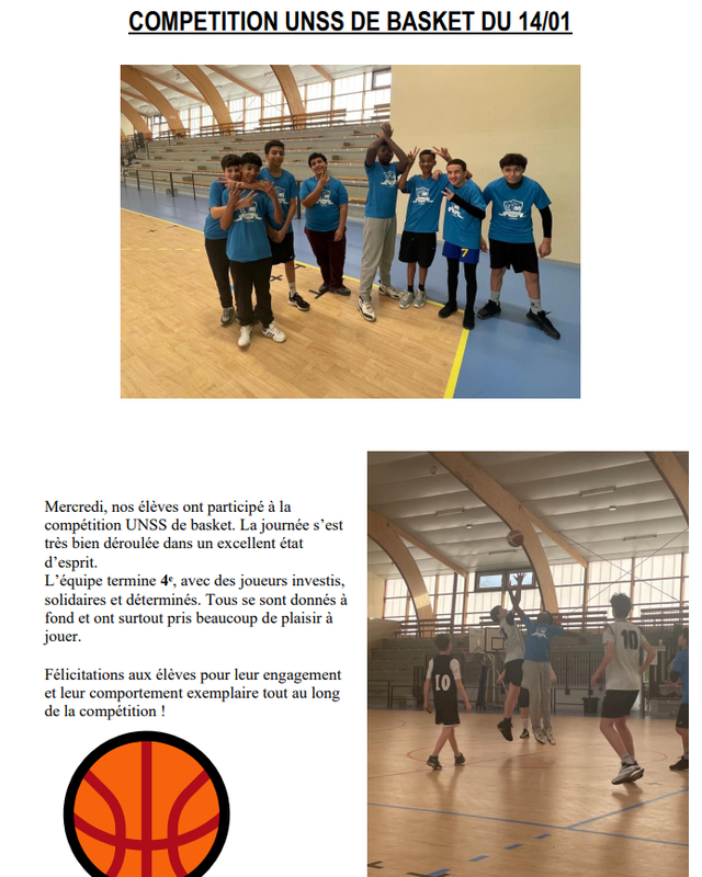 Mercredi, nos élèves ont participé à la compétition UNSS de basket. La journée s’est très bien déroulée dans un excellent état d’esprit.